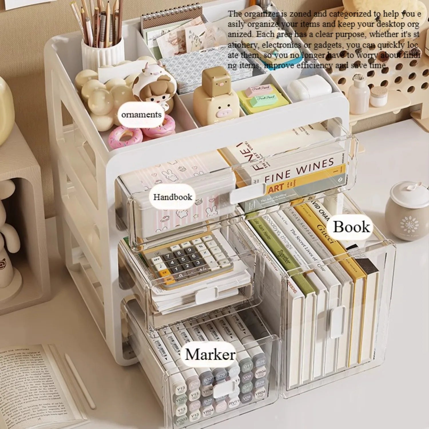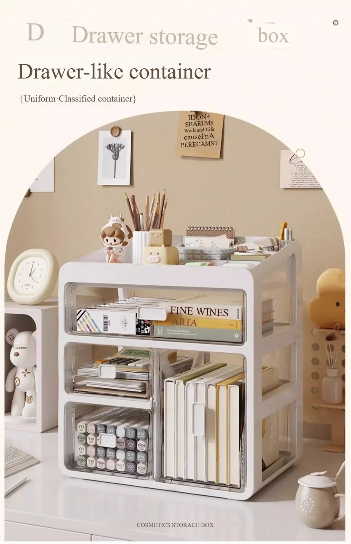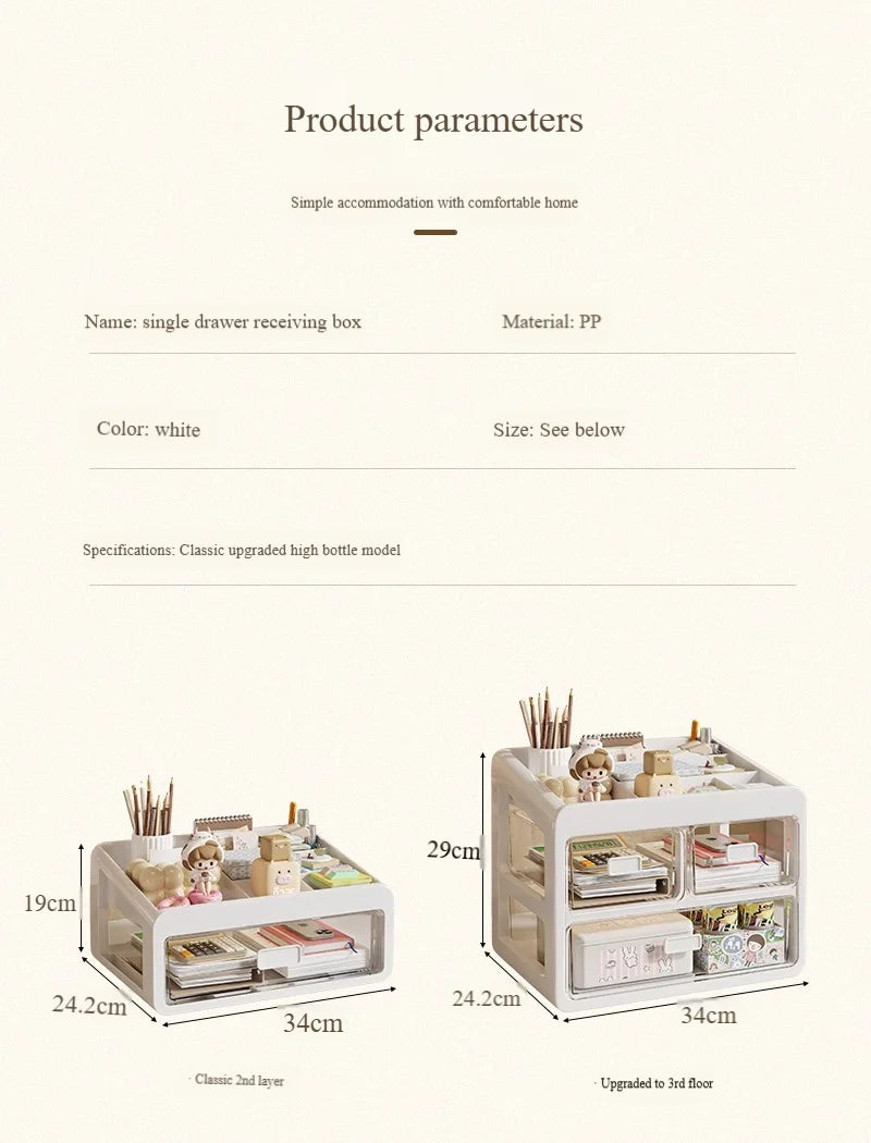 This all-in-one drawer desktop organizer features 3 smooth-sliding drawers and a top compartment with divided sections, perfect for classified storage of stationery, cosmetics, tools, and more. The built-in card slots ensure items stay securely in place, even when tilted, preventing accidental drops.